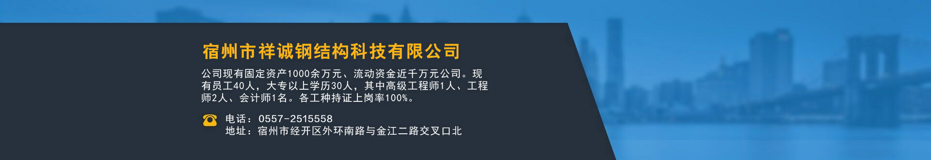 宿州市祥誠鋼結(jié)構(gòu)科技有限公司位于宿州市經(jīng)開區(qū)外環(huán)南路與金江二路交叉口北,公司是一家以建設(shè)產(chǎn)業(yè)化為目標(biāo),匯集大型鋼結(jié)構(gòu)廠房、彩鋼活動房設(shè)計、制作、安裝施工一條龍服務(wù)的知名鋼結(jié)構(gòu)公司。公司現(xiàn)有固定資產(chǎn)1000余萬元、流動資金近千萬元公司。現(xiàn)有員工40人,大專以上學(xué)歷30人,其中高級工程師1人、工程師2人、會計師1名。各工種持證上崗率100%。高效化的年青團隊為公司帶來了蓬勃發(fā)展的動力,全體員工以務(wù)實的態(tài)度,拼搏的精神,創(chuàng)造著企業(yè)的每一天。 公司組織結(jié)構(gòu)嚴(yán)格按現(xiàn)代企業(yè)制度設(shè)計,管理機構(gòu)設(shè)置合理,制度完善,各部門分工明確...